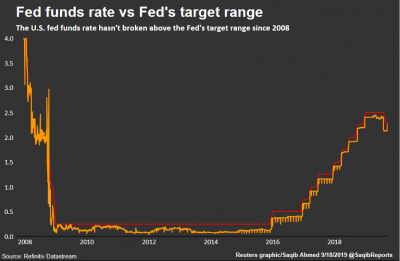 И первые симптомы надвигающегося коллапса опять появились на поверхности. Всего несколько дней назад ставка РЕПО (general collateral financing) выросла до 3 %, а вчера поднималась даже до 4%.