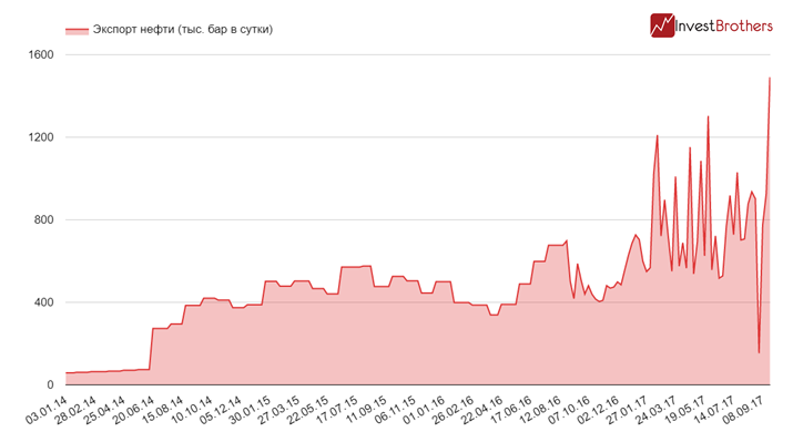 За неделю с 15 по 22 сентября среднесуточный экспорт нефти из США приблизился к 1,5 млн баррелей в день – абсолютный максимум за всю историю наблюдений.
