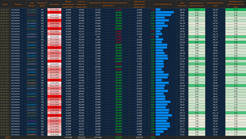 Минфин России 27.09.2017 разместил ОФЗ 26222RMFS и 26214RMFS, объем размещен не полностью.