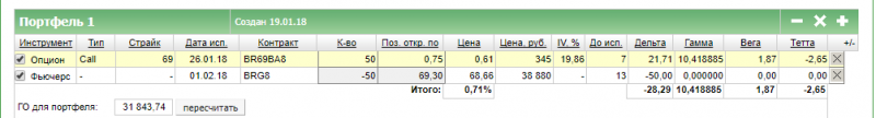 Всех приветствую! Продолжаю писать серию постов про опционы. Сегодня хочу описать опционную стратегию которую открыл вчера вечером. Так как до экспирации опционов на нефть остается около недели (26.01.2018) и опционные премии сильно уменьшились – то решил сделать следующую комбинацию: Покупаем опцион КОЛЛ с 69 страйком и продаем фьючерс. . Расчет на падение цены на нефть. Чем ниже цена – тем больше прибыль. Размер прибыли неограничен. Покупкой опциона я хеджирую свои риски в случае роста цены и ограничиваю свои убытки разницей между премией опциона заплаченной мной и ценой продажи фьючерса . Да, хочу заметить что мне вчера немного повезло, так как я вначале купил опционы за минуту до клиринга в 18-44, а продал фьючерсы уже на вечерней сессии. Итак что я сделал в реале: