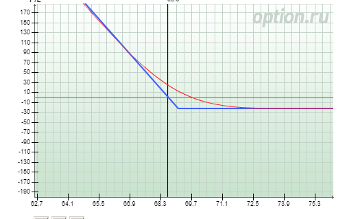 Мой возможный максимальный убыток составит на дату экспирации 45 центов. Точка безубыточности на дату экспирации – 68.55. Все что ниже этой цены на дату экспирации – будет прибыль. Но ждать экспирации не обязательно. Если закрыть позицию по текущим ценам (68.7 –фьючерс и 60 центов по опциону) можно зафиксировать прибыль. Она составит как разница между ((69.3-68.66)+(61-75))*50(количество контрактов)
