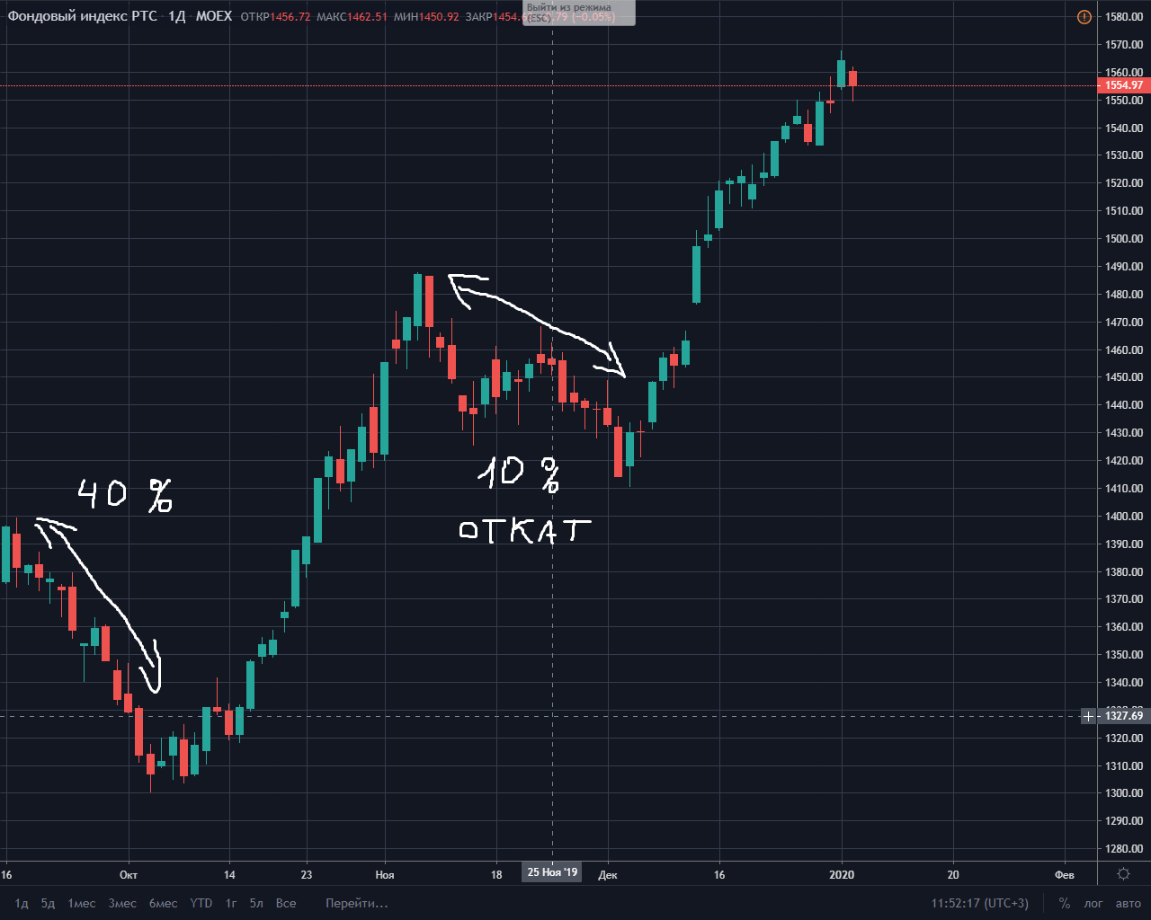 Последний откат на РТС был примерно 10-15% ,после этого цена ещё хорошенько подросла ,