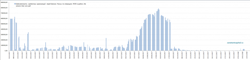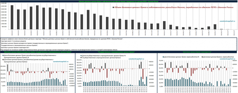 Объема долговых ценных бумаг в собственности российских банков, переданных по сделкам РЕПО с Банком России, по данным статистики ЦБ. 2015 - 2017 г.: