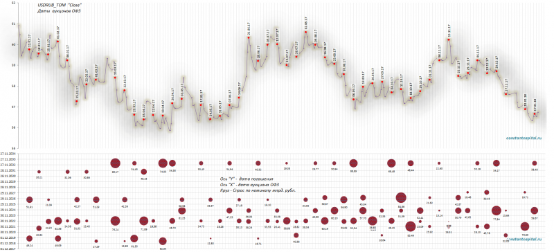 График размещений ОФЗ (по параметрам - дата погашения; спрос при размещение) в соотношение с графиком #USDRUB
