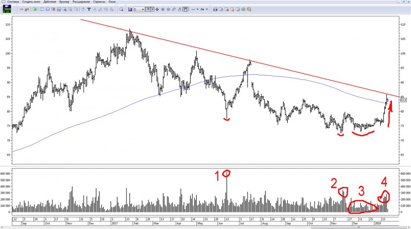 4. Пошли на повышающихся объемах к линии нисходящего тренда.