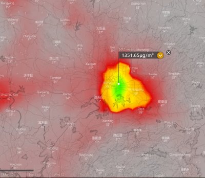 Данные с windy.com показывают массовое выделение газообразного диоксида серы с окраин Ухани, что обычно связано с сжиганием органических веществ. Уровни повышены, даже по сравнению с остальной частью Китая.