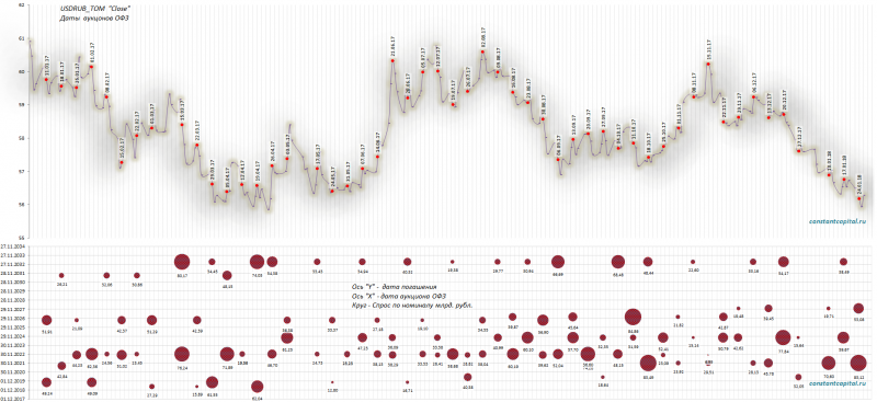 График размещений ОФЗ (по параметрам - дата погашения; спрос при размещение) в соотношение с графиком USDRUB