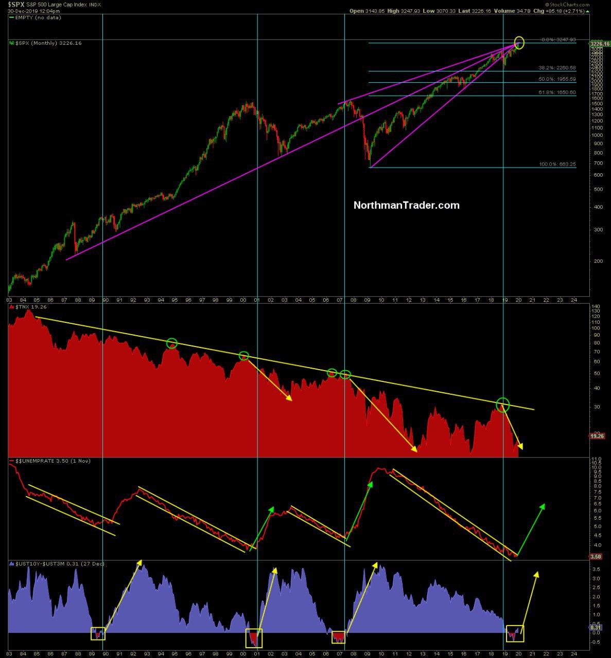Сверху вниз: SPX, американские: доходности десятилеток, безработица и спред доходностей гособлигаций (10 лет-3 мес).