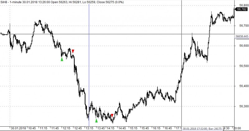 Мои вчерашние сделки (2018.01.30) не показали ни прибыли, ни большого убытка. В 12-15 си купил в расчете на отскок, а в 12-33 ри продал. Сишка отскакивала, но ее продолжали поддавливать вниз, прикрыл ее в ноль вовремя (12-44). Когда она продолжила валиться решил и ри прикрыть (12-48). Потом в 13-44 купил си, тоже прикрыл не дождавшись роста. Вывод из вчерашней торговли такой — в двух случаях из трех я открылся правильно, но не дождавшись движения цены в свою сторону закрыл сделки. Или можно сказать по другому — в трех случаях из трех открылся правильно, и два раза неправильно закрылся, один раз правильно. Такие ситуации встречаются очень часто, и каждый раз терзают сомнения. Есть у меня версия, что я спешу со входом. И, возможно, выход из сложившейся ситуации — это заходить не одной сделкой - разбить вход, например, на 3 части. Или, например, в шорт заходить на белой свечке, но тут не угадаешь, всегда по разному.