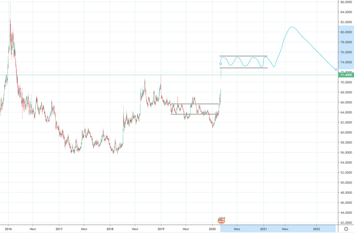 В текущий момент я смотрю на нефть только от покупки на долгосрок, но покупать пока не собираюсь. Почему? Ответ ниже (опять же из моего прогноза):