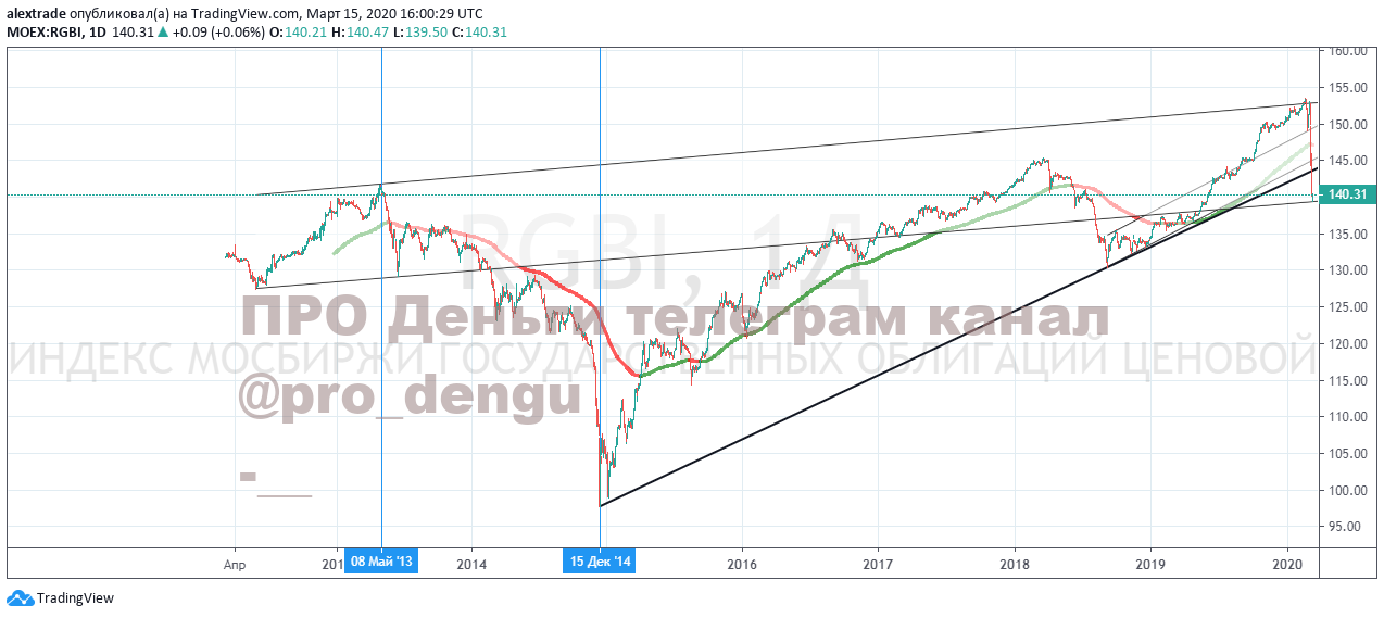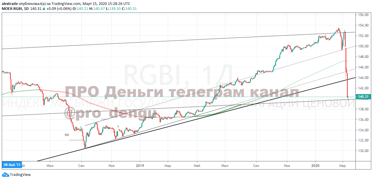 Индекс пробил две линии растущего тренда от 18 года и что еще хуже от 2014 года. Аптренд умер. Для любителей индикаторов, "по старинке", наложил 200 EMA (ее часто используют трейдеры для определения среднесрочного тренда), ее тоже прошили вниз. Зарождается глобальный даунтренд старшего порядка. Момент уникальный. Схожий момент был в мае 2013 года даунтренд развивался по декабрь 2014 г., этот даунтренд за 590 дней привел RGBI с 141+ на 97+.