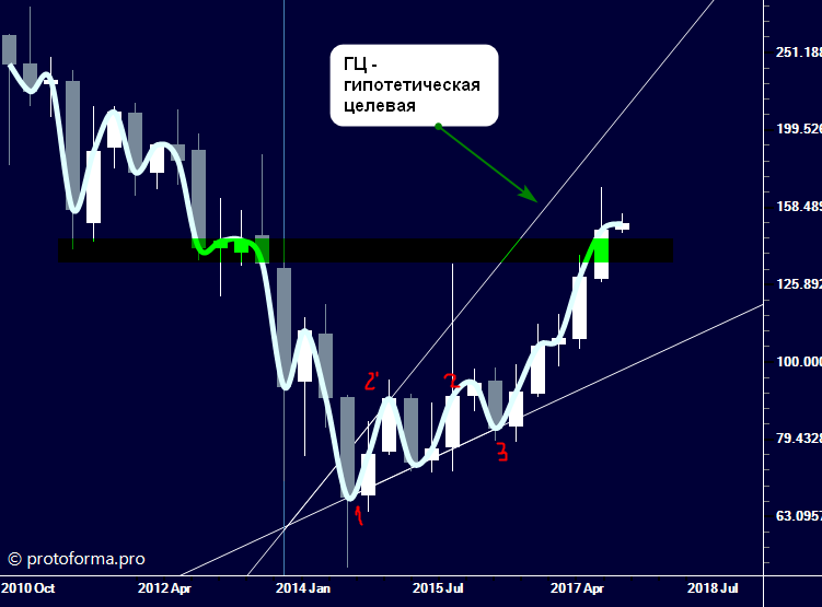 Если посмотреть на график акций компании, то после провала и санкций в 2014-м году тренд набирает обороты, цена пробила уровень сопротивления и находится в районе ГЦ (гипотетической целевой), квартальный график (построение по ценам закрытия):