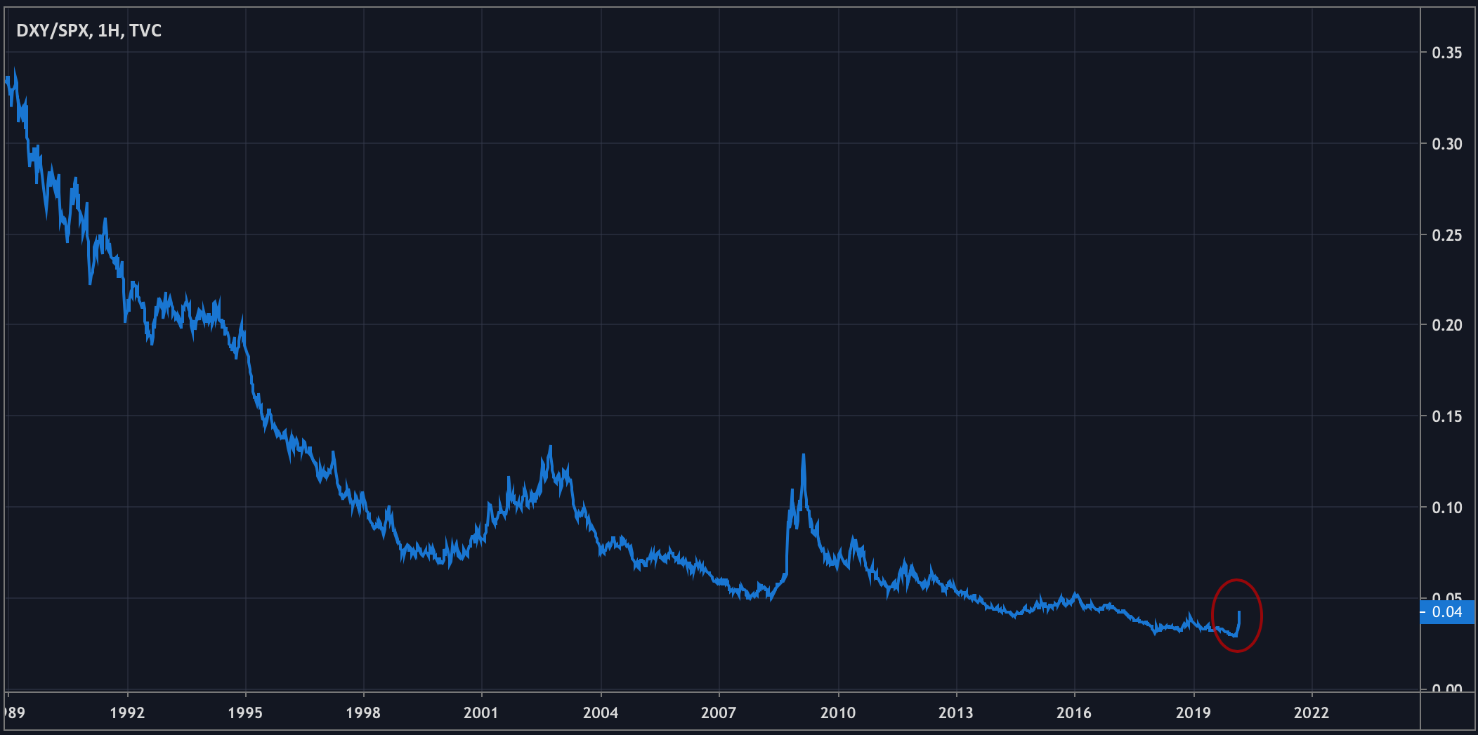 Если предположить, что мы входим в циклический кризис - то прошедшее движение, хоть и кажется нам сильным, - только цветочки начало, едва заметное на графике спреда DXY/SPX.