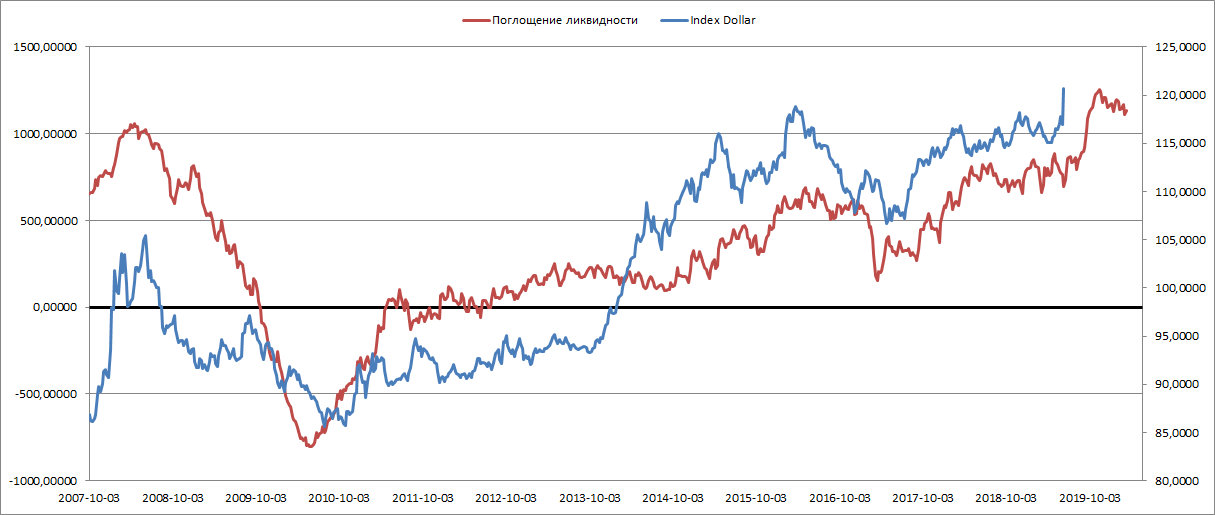 Мы видим, что низко ликвидных денег накоплено больше, чем в 2008 году, но это не столь страшно, т.к. в принципе денег больше. Естественный процесс – чем больше денег в сбережениях и не расходуется, тем их меньше остаётся на расходы, как следствие доллар дорожает. Присутствует временной лаг в данном процессе, который составляет около полугода. И мы видим, что показатель поглощения ликвидности перестал расти, что весьма положительно для перспектив снижения доллара уже во вторую половину 2020 года.