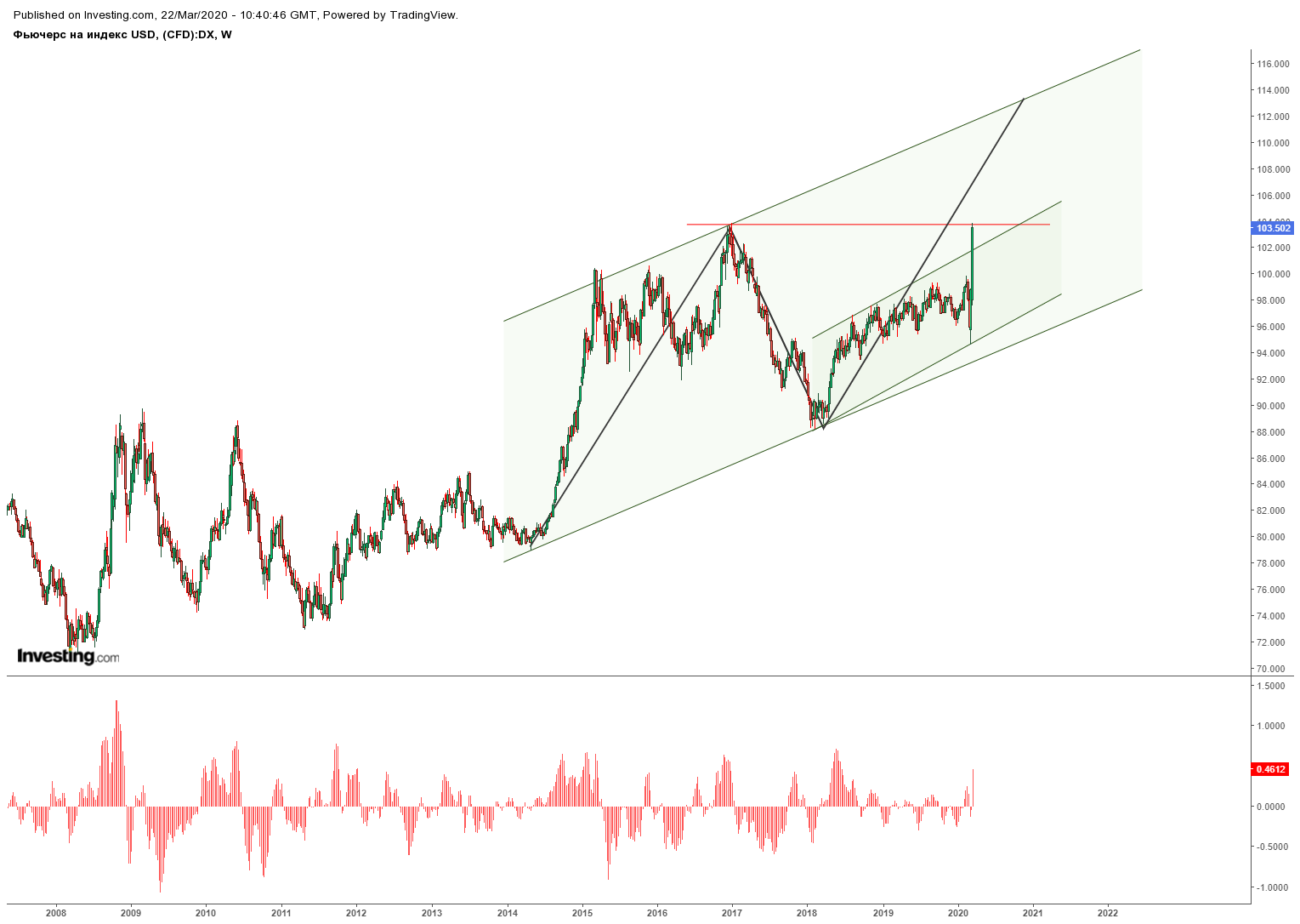 Прежде чем перейдем к технической картинке подытожим. Мы видим, что перспективы доллара в текущих условиях слабеть. Но сейчас, в условиях финансового кризиса, присутствует сильнейший дефицит долларовой ликвидности в мире, это заставляет экономических агентов продавать свою валюту и покупать доллары «на все». ФРС и остальные ведущие ЦБ оперативно и согласовано действуют по спасению мира от дефицита доллара, смогли ли они это сделать, пока оценить сложно. Но точно, рано или поздно долларовая ликвидность сбалансируется и долларов станет очень много, с учетом новых вливаний, которые беспрецедентные.