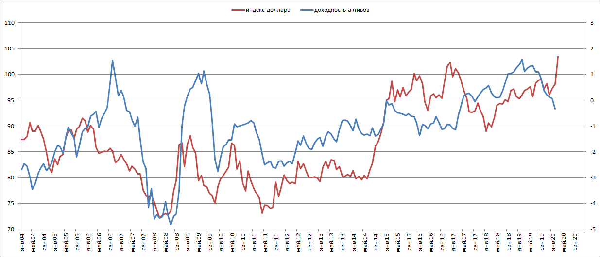 Раз затронули вопрос о ставках, продолжим эту тему в следующей теории оценки валютного курса, которая оценивает доходность активов в разных валютах. Пара слов о сути данного способа оценки, логичным является предпосылка, чем меньше актив приносит денег. Тем меньше на него спрос. Мировой финансовый рынок имеет разные виды активов как внутри страны, так и за ее пределами. Спрос на валюты страны тесно связан с уровнем ставки в данной стране, если ставка выше, чем у других, тем спрос на ее финансовые активы будет выше (вопрос о рисках здесь пропускаем). Итак, мы знаем, что ФРС (ЦБ США) снизил ставку до уровня 0-0,25% годовых, т.е. сравнялся со ставкой в Европе, и ниже ставок большинства развитых стран, ниже только в Швейцарии и Японии. На картинке ниже синей линией, нанесена доходность активов в США относительно стран G10 с учетом годовой инфляции. Красная линия – индекс доллара.
