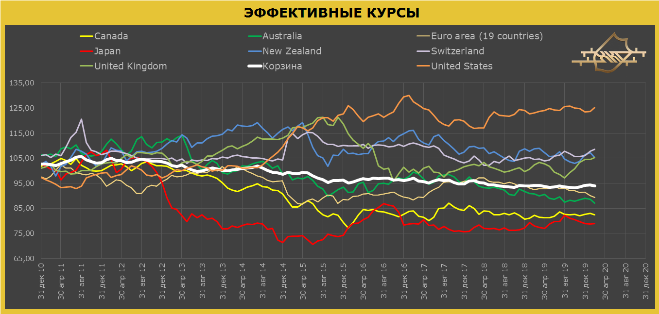 Рыжая линия – это курс доллара США, мы видим, что курс доллара находится выше всех стран , это очень плохо для экспорта товаров номинированных в долларе, а мы знаем, что США заключила торговую сделку с Китаем и трансформировала соглашение НАФТА (Канада-Мексика-США), т.е. курс доллара нужен низкий, плюс это пагубно сказывается на госдолге, который дорожает вместе с курсом.