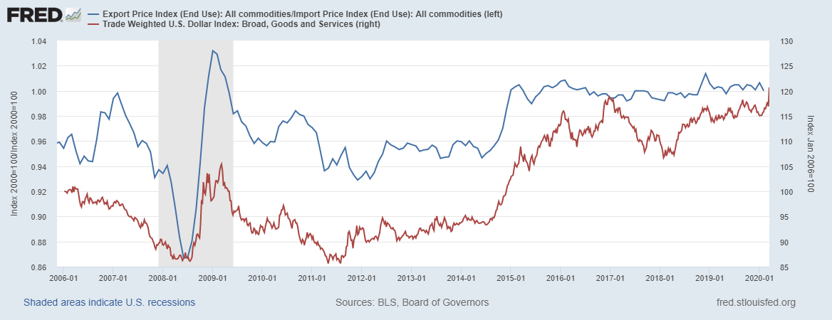 Следующая теория, которая очень важная в оценки валюты – это теория «условий торговли». Она отвечает на вопрос насколько выгодно стране экспортировать товары относительно импорта. На картинке это отображено синей линией, красная линия – индекс доллара.