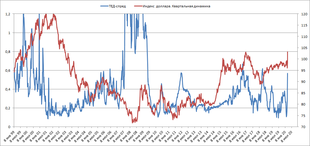На картинке ниже еще одна иллюстрация о дефиците долларе на международном рынке. Синей линией, нанесен ТЕД-спред, этот показатель измеряет стоимость долларов на международном рынке в Лондоне, т.е. сколько стоят доллары (ставка) за пределами США.