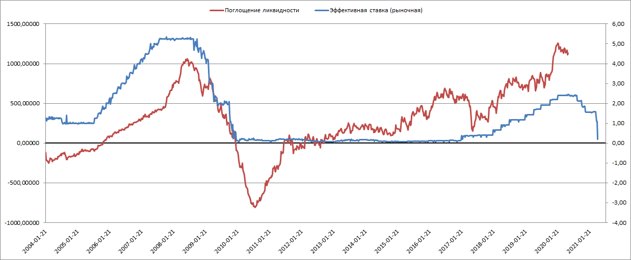Логично, что на свойства денег влияет процентная ставка, когда она растет – люди сберегают больше, когда снижается – тратят больше. Это все связано с альтернативными издержками, т.к. под 10% будут больше сохранять, чем под 3% в год. Ниже иллюстрации к этой теории, красная линия выше рассмотренный показатель поглощения ликвидности, синяя – рыночная ставка в США.