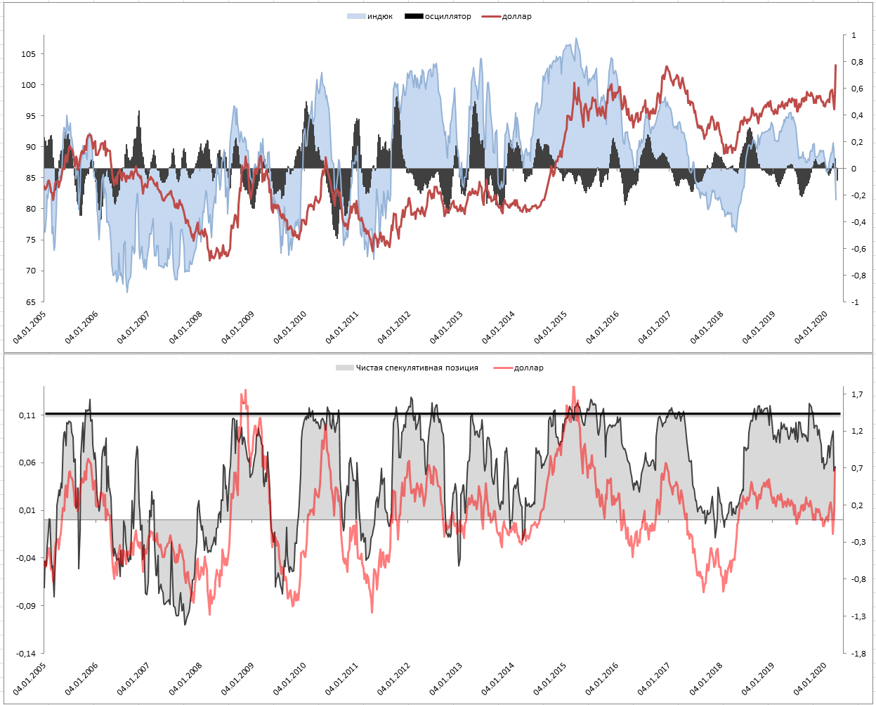 На нижней картинке чистая спекулятивная позиция по фьючерсам торгуемых на ICE нанесена серой областью. Красная линия – это индекс доллара в динамике от квартала к кварталу.