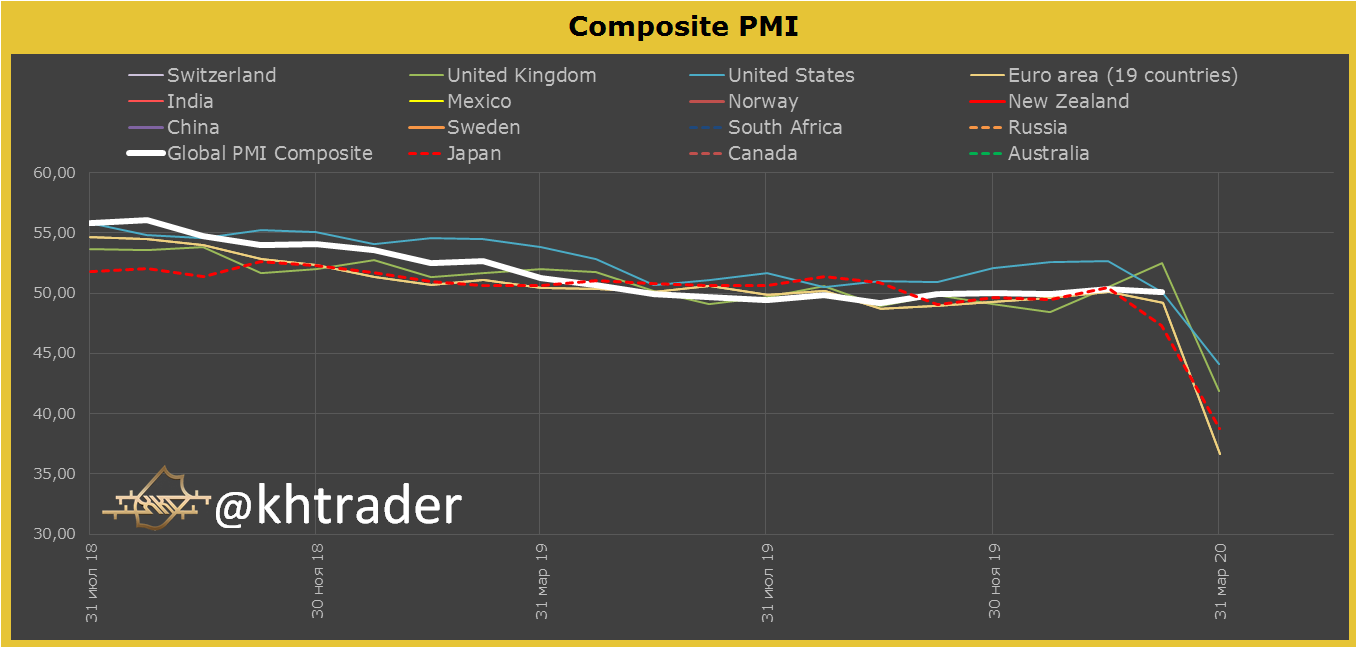 Их картинки следует, что мир уже в состоянии рецессии, т.к. уход показателя ниже 50 сигнализирует именно об этом. Это некий водораздел между ростом экономики и ее сокращение. Ситуация сложная и весьма тонкая, т.к. пик пандемии еще не пройден, а последствия уже печальные. Сегодня Конгресс США принял закон о поддержке бизнеса Белым домом на 2 трлн долларов, это первый шаг к запуску экономики, совершенно не ясно зачем спешить, но видимо меры будут предприняты уже в апреле. Уверен, что примеру Белого дома последуют все государства G7.