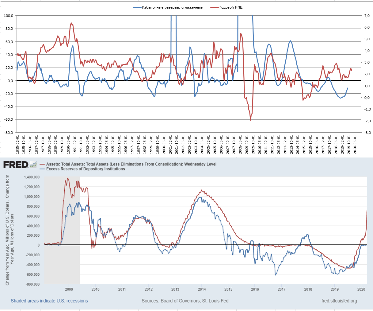 Как писал в своем канале Телеграмм https://teleg.one/khtrader рост баланса ФРС однозначно приведет к росту избыточных резервов, которые в свою очередь являются надежным сигналом надвигающийся инфляции. Это проиллюстрировано на картинке ниже