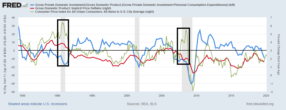 Прямоугольниками отмечены моменты начала кризисов в начале 90-х и конце 00-х. В обоих случаях мы наблюдали резкий рост ИПЦ выше дефлятора. Еще немаловажным является то, что баланс инвестиции/сбережения уходил гораздо глубже, т.е. нас ждет ухудшение экономической ситуации в США, а значит и мире.