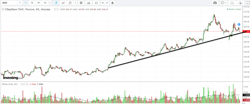 Здесь очень хорошо видно что уровнем краткосрочного тренда в грефбанке является 255. Первая попытка пробоя провалилась, но она изначально была с таким сильным гепом сомнительной. Пока грефбанк очень не желает этот самый тренд пробивать. Но уход ниже 255 можно воспринимать как сигнал на продажу.