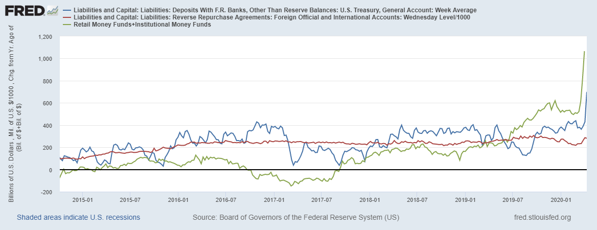 На картинке синей линией нанесен баланс ФРС, за неделю баланс вырос на 271,4 млрд долларов и поставил новый рекорд 6,083 трлн долларов, перевалив через отметку в 6 трлн. С учетом программы поддержки долгового рынка, этот баланс будет расти еще, до каких пределов пока сказать сложно, но тренд устойчивый.