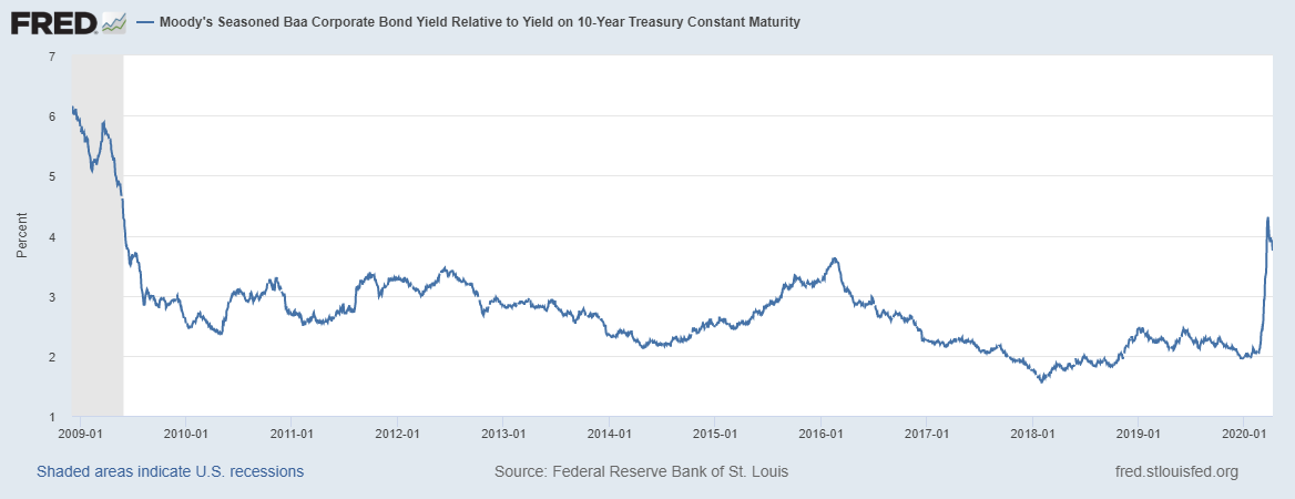 Также долговой рынок остается в дисбалансе, на картинке ниже спред между 10-летним трежерис и корпоративными облигация инвестиционного уровня.