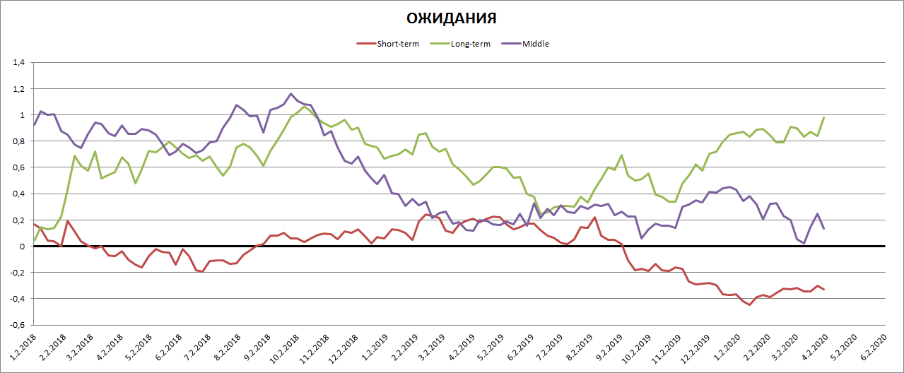 Синяя линия – это разница между июньским и апрельским фьючерсными контрактами. Показатель ниже нуля, т.е. июньские фьючерсы, торгуется гораздо ниже, что по финтеории указывает на более высокие ожидаемые ставки в июне. Это говорит о стабилизации долгового рынка, что весьма положительно в нынешних условиях.