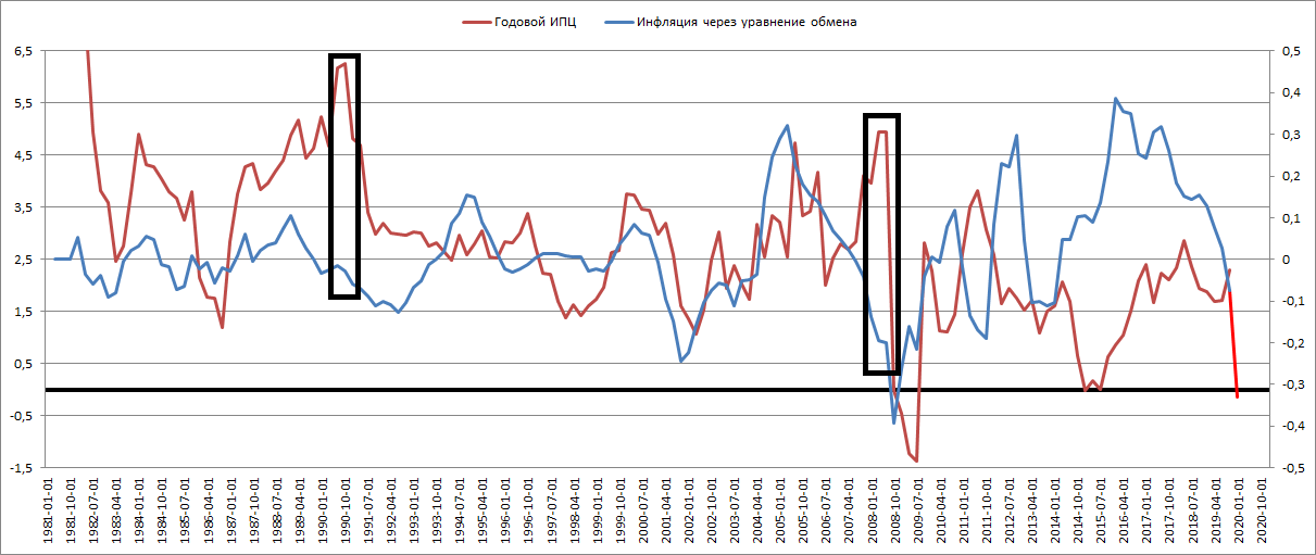 Мы видим, что в моменты кризиса, инфляция резко подскакивает и потом падает вслед за моделью. Так было в 2008 и 1990 годах, вначале 00-х этого удалось избежать.