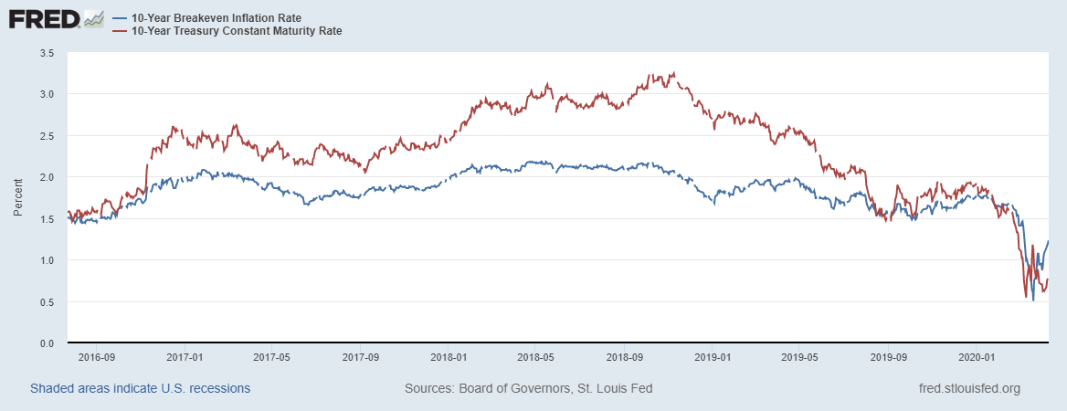 Синей линией, нанесены инфляционные ожидания, а красная линия – это доходность 10-летних трежерис. Как видим, облигации не поспевают за ожиданиями.