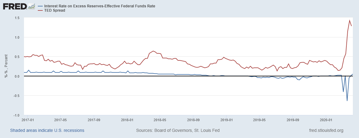 Дифференциалы ставок на финансовом рынке США приходят в норму, на первой картинке спред между ставкой по избыточным резервам и рыночной (эффективной) ставкой, нанесена синей линией. Мы видим, что показатель выше ноля, т.е. рыночные ставки пришли в норму.