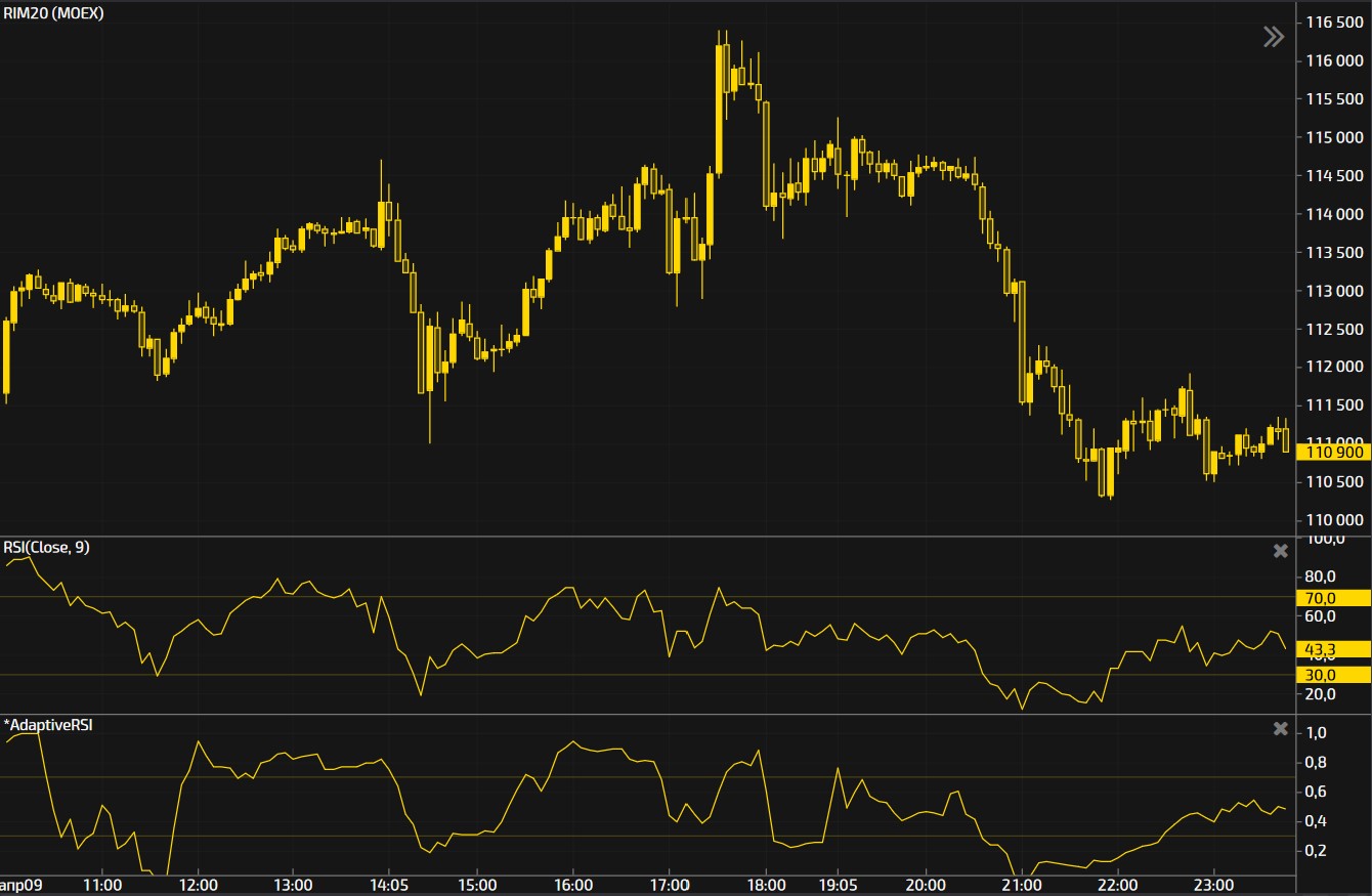 График М5 Фьючерс RIM20. КлассическийRSI (Close,9) / Версия от John Ehlers Adaptive RSI