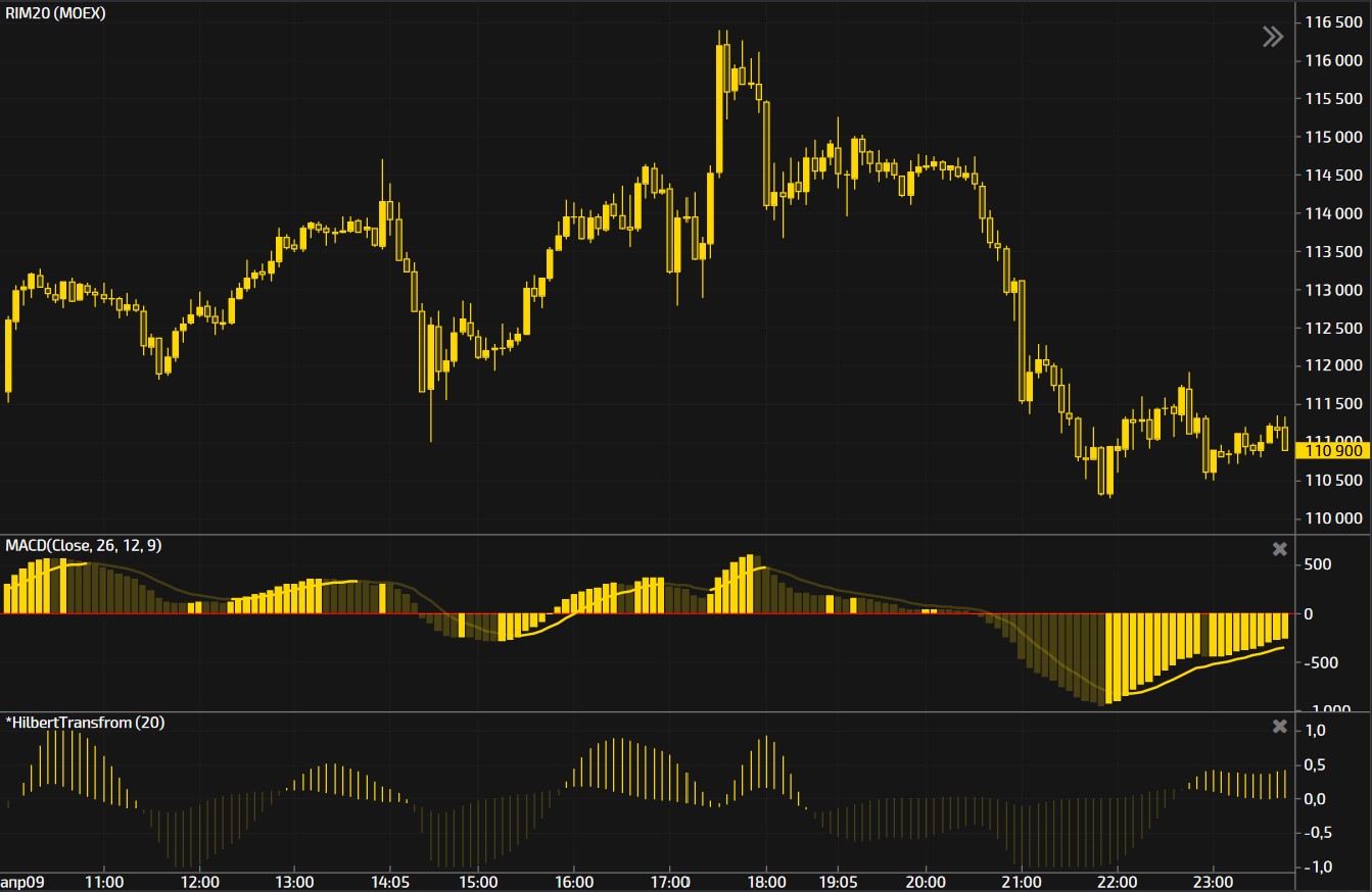 График М5 Фьючерс RIM20. КлассическийMACD (26,12,9) / Версия от John Ehlers Hilbert Transform