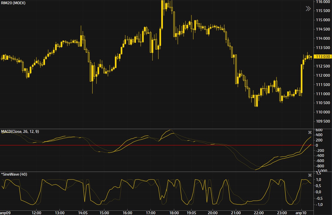 График М5 Фьючерс RIM20. КлассическийMACD (26,12,9) / Версия от John Ehlers SineWave