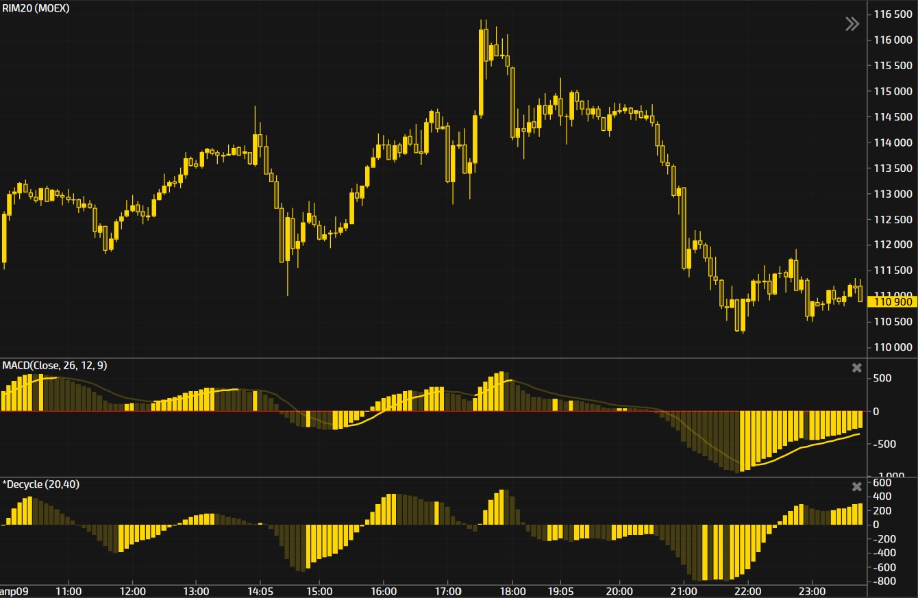 График М5 Фьючерс RIM20. КлассическийMACD (26,12,9) / Версия от John Ehlers Decycle