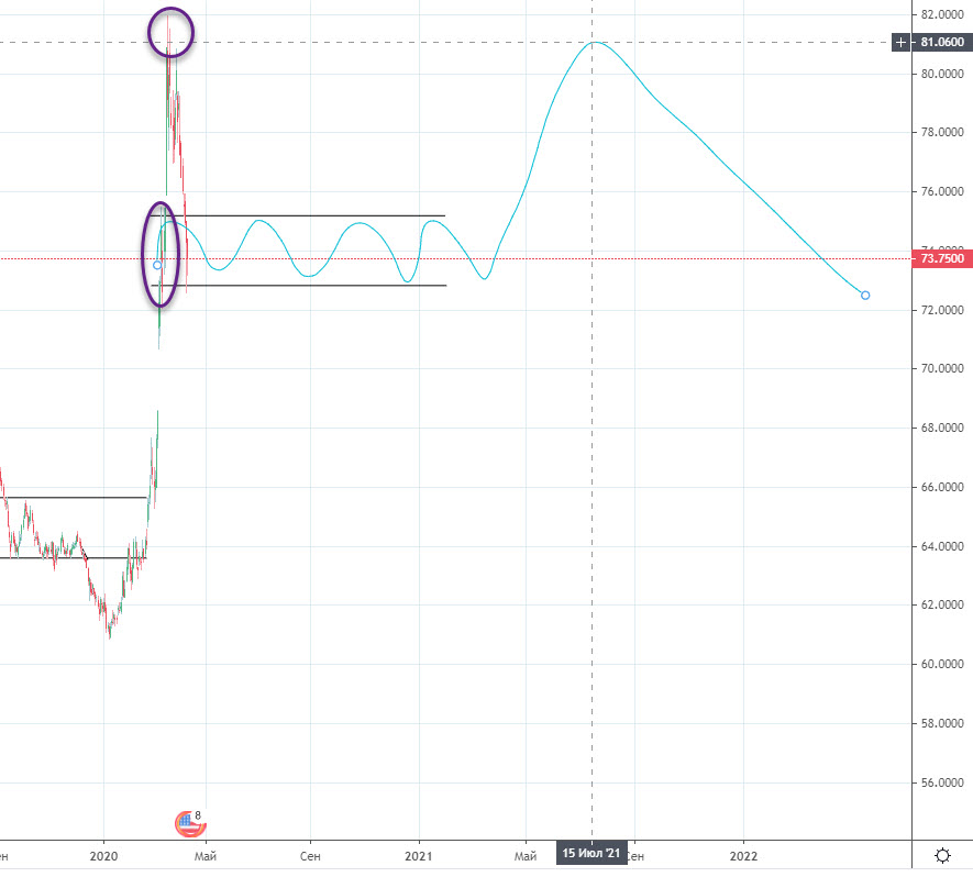 Рубль пару дней попилися в диапазоне 72-74, показал хаи добив до 82 и поехал укрепляться. Пока не очень понятно, будет ли еще один поход рубля на ослабление? Будет ли он в ближайшее время или только во вторую волну кризиса ближе к концу года? В любом случае, я рад, что от уровней 74 (и выше) продал большую часть своей валюты.