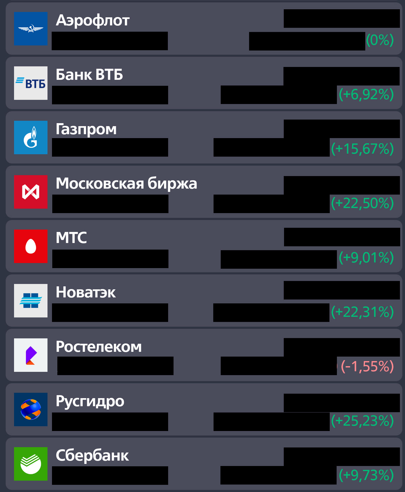 Мой портфель российских акций, купленный 12 марта, так же показывает хороший плюс. Исключение только в акциях Аэрофлота и Ростелекома, я их покупал еще в начале прошлого месяца – далеко от их лоев:
