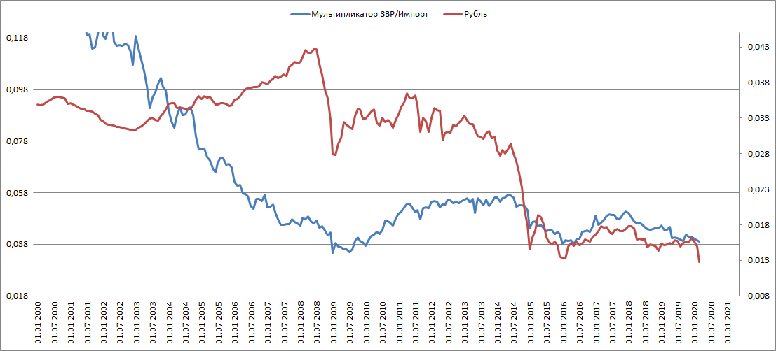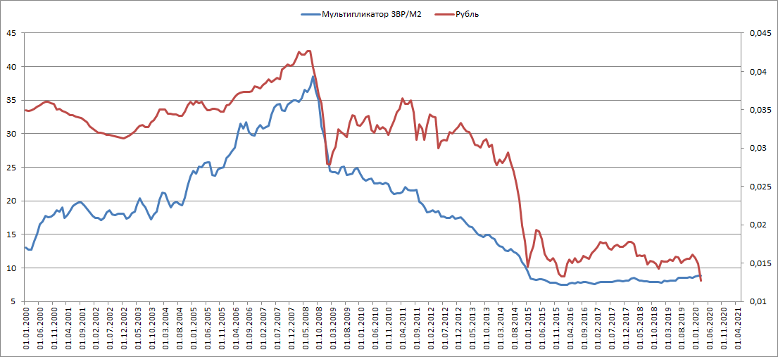 Сначала посмотрим на пару важных, для оценки странового риска, мультипликатора. Первый – это мультипликатор соотношения золотовалютных резервов и денежной массы. Этот коэффициент показывает покрытие денежной массы ЗВР.