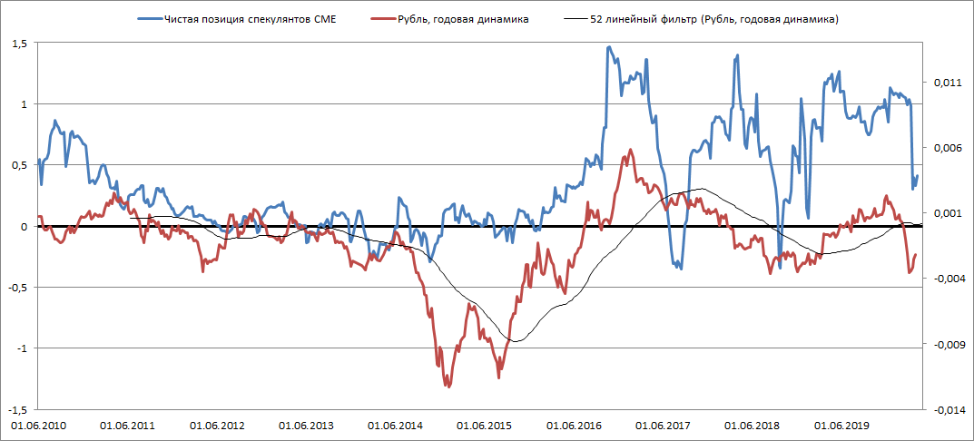 Синяя линия – это чистая спекулятивная позиция, это голосование «долларом» - ставка. Насколько этот показатель репрезентативный сказать сложно, но по моему опыту очень надежный. Мы видим хорошую связь позиции спекулянтов с годовой динамикой рубля (от года к году). Сейчас спекулянты распродались и не спешат покупать, т.е. нужно пройти важные уровни для того, что бы спекулянты начали торговать по тренду на укрепление рубля.