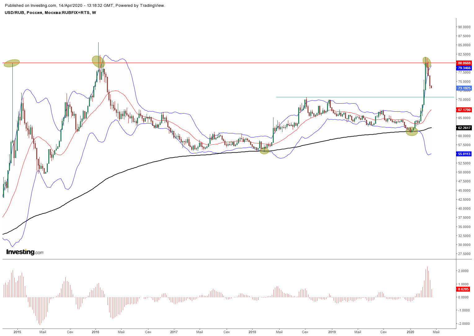 Что «рисует» цена: мы имеем сверху уровень – максимум 2014 года, который является сильнейшим сопротивлением. Снизу у нас есть уверенная поддержка в виде скользящей средней длинной в 200 недель (черная линия), которая сейчас проходит на значении 62,2. По сути, диапазон 80-62,5 это тот канал, где может болтаться цена.