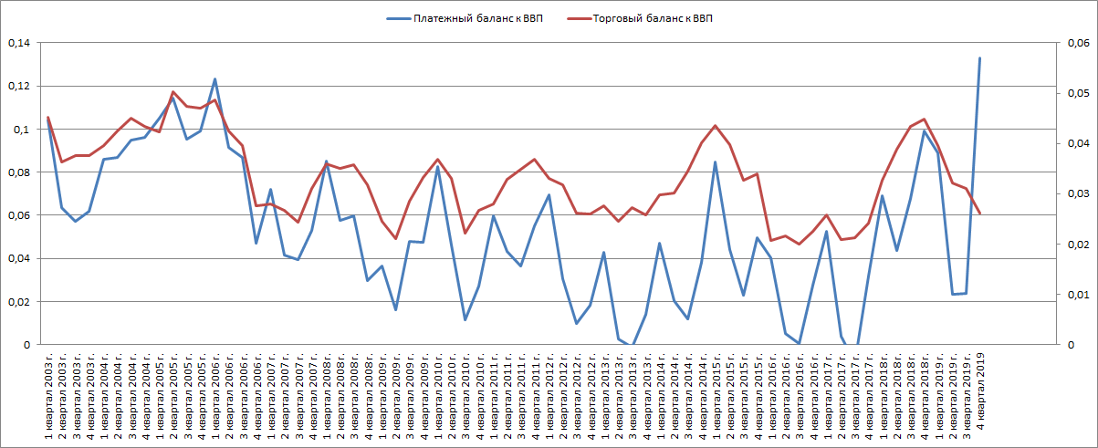Здесь сомнений нет, цены на мировом рынке нефти и нефтепродуктов сильно влияют на профицит платежного баланса, от которого пляшет бюджет и стимулируется ВВП. Это и немудрено, т.к. доля экспорта нефти и нефтепродуктов в совокупном объеме экспорта выраженного в долларах составляет 47% на 4 квартал 2019 года.