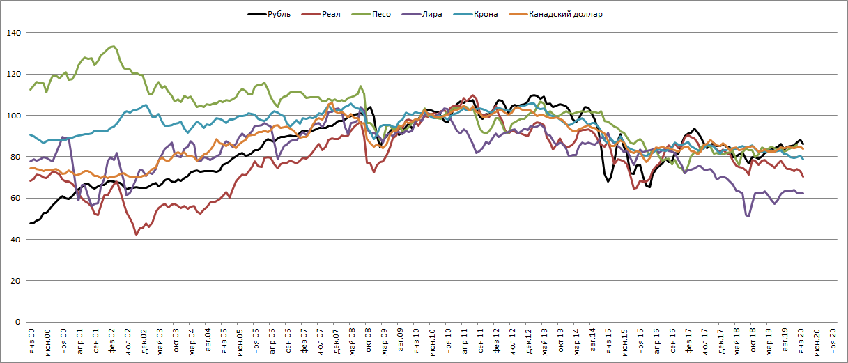 Стоит напомнить, что не мы одни в мире имеем привязанную национальную валюту к ценам на сырье. Также канадский доллар и норвежская крона плотно привязаны к нефтяным баррелям. Ниже на картинке завершим оценку национальной валюты через теории международной торговли и смотрим, как себя чувствуют валюты развивающихся стран. Возьмем для этого торгово-взвешенные эффективные реальные курсы, кроме оговоренных выше валют, Бразилии, Турции и Мексики.