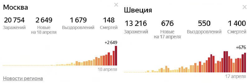 Ну и наконец просто сравним динамику новых заболеваний в Швеции и в Москве где карантин введён:
