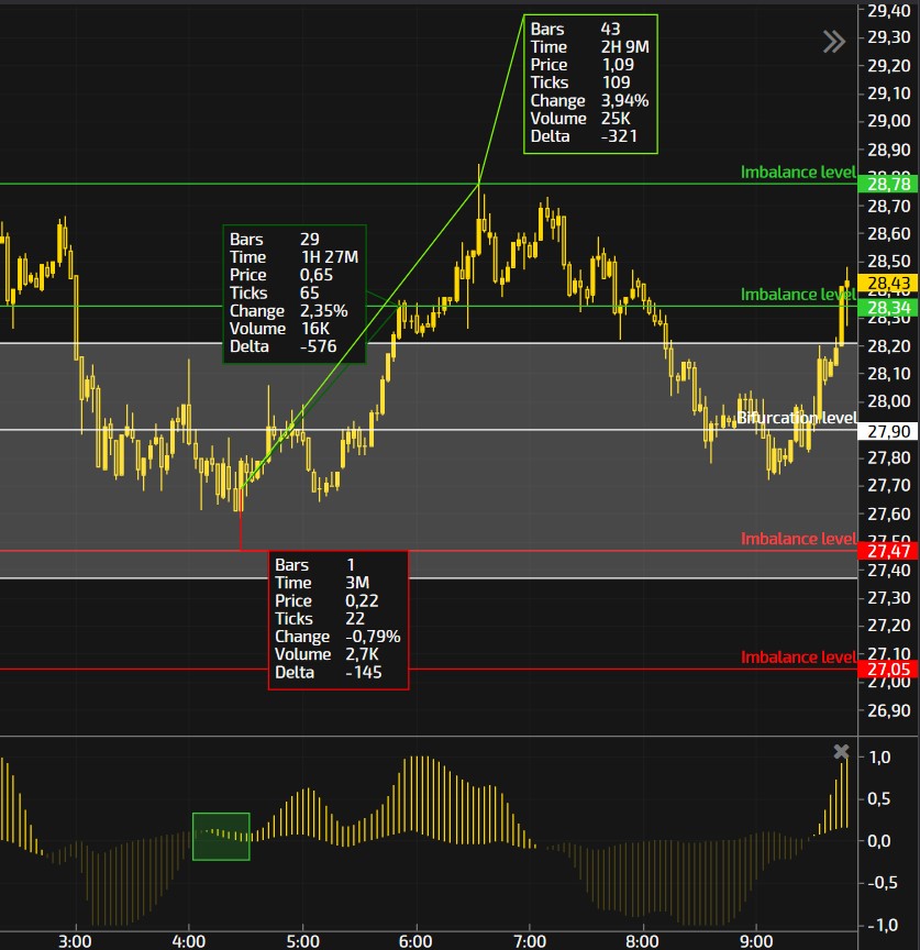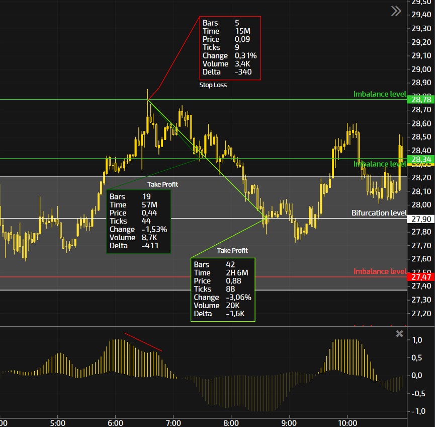 Пример №2: индикатор демонстрирует образование шортовой дивергенции, так выше Imbalance level (28.78) уровни отсутствуют, то при открытии позиции по цене 28.78 стоп лосс выставлен, на локальный хай и составляет 9 тиков. Первый тейк профит можно выставить на Imbalance level (28.34) что составит 44 тиков, второй тейк профит на на Bifurcation level (27.90). Таким образом итоговый тейк профит составляет 88 тиков.