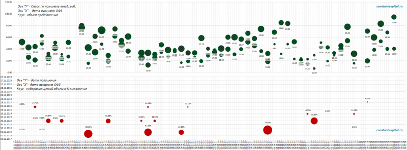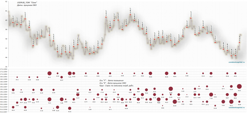 График размещений ОФЗ (по параметрам - дата погашения; спрос при размещение) в соотношение с графиком USDRUB