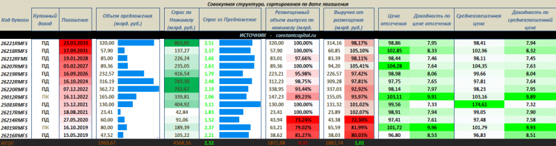 Полный список размещений ОФЗ, с учетом результатов последнего аукциона